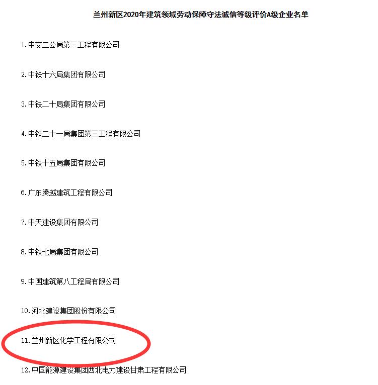 近日,从兰州新区民政司法和社会保障局获悉,兰州新区化学工程有限公司被认定为兰州新区2020年建筑领域劳动保障守法诚信等级评价A级企业,成为兰州新区唯一一家获得此荣誉的新区国有企业。