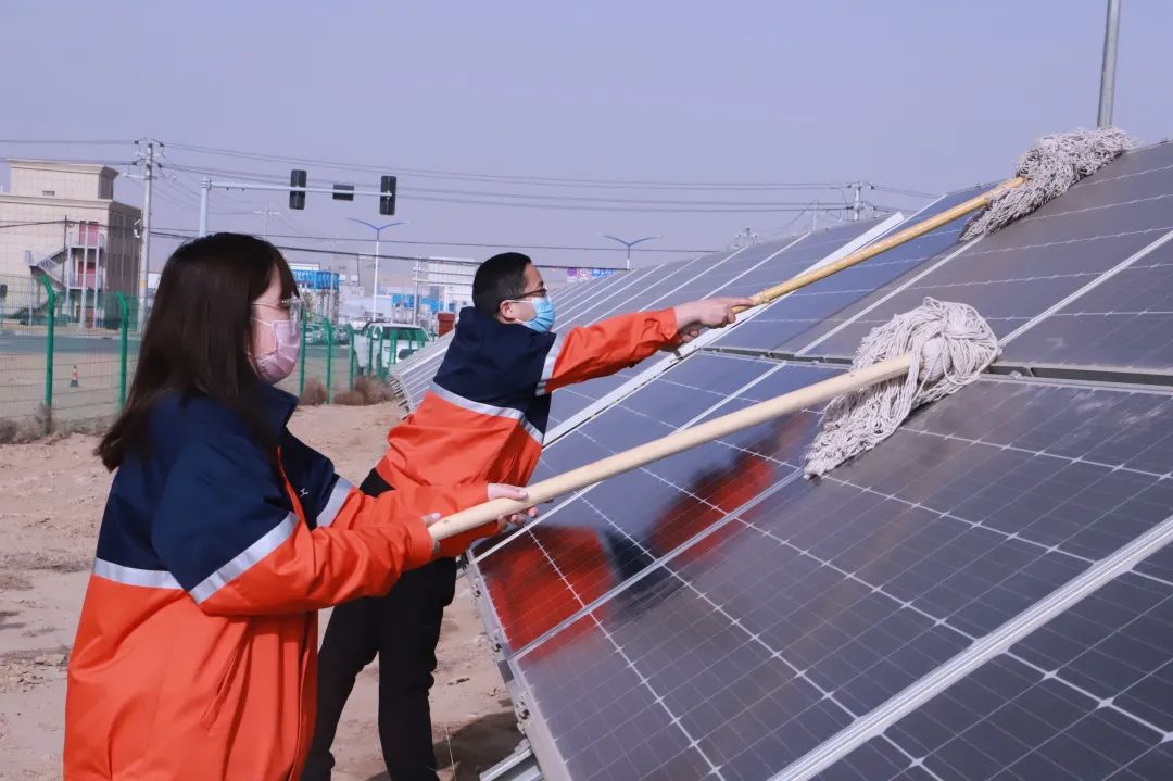 活动伊始,专业人员为大家现场讲解安全要点和运维重点,使大家了解到光伏板长期暴露在自然条件下,清洁程度直接影响光电转换效率,必须把定期擦拭数以万计的光伏板作为日常运维重点,及时清除鸟粪、灰尘等顽固污渍遮挡,才能避免形成热板效应、造成组件损坏。党员干部职工在明确各项清洗作业要求及安全注意事项前提下,分时段、分区域、分小组对各方阵开展清洗工作,手持抹布和拖把等清洁工具,穿行在光伏板之间,逐块进行清理,仔细抹擦着每一块光伏板,确保电站安全平稳高效运行。